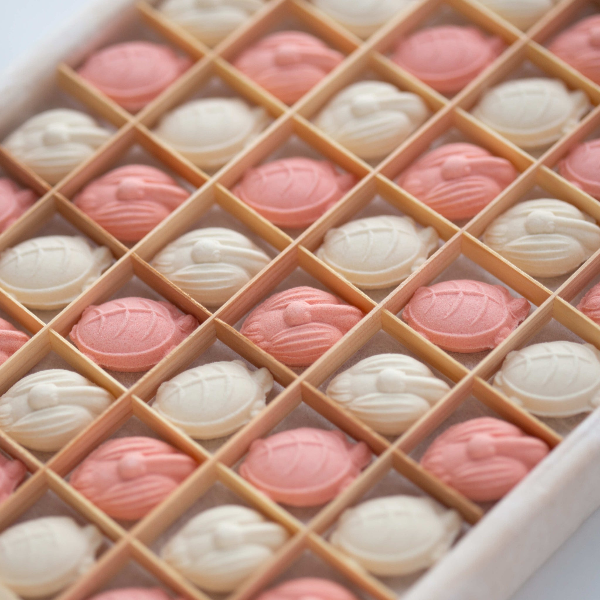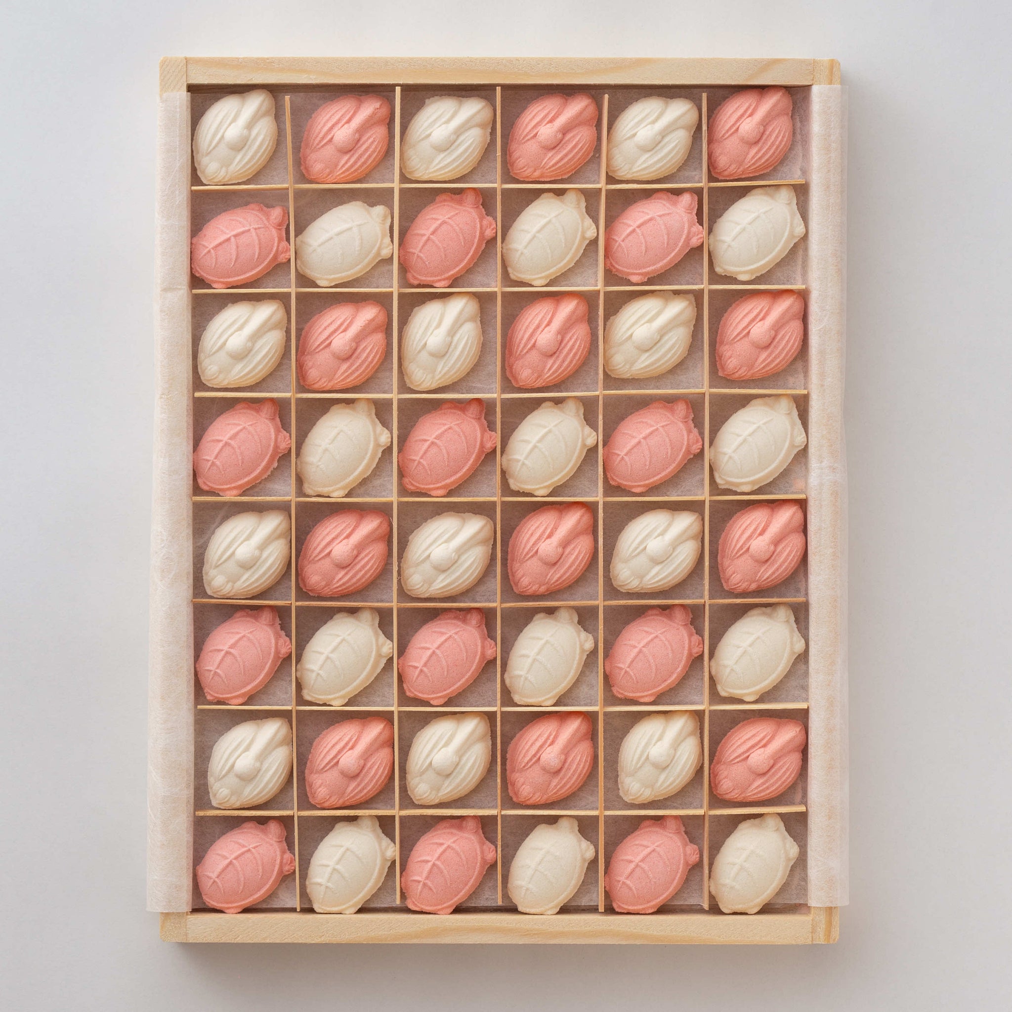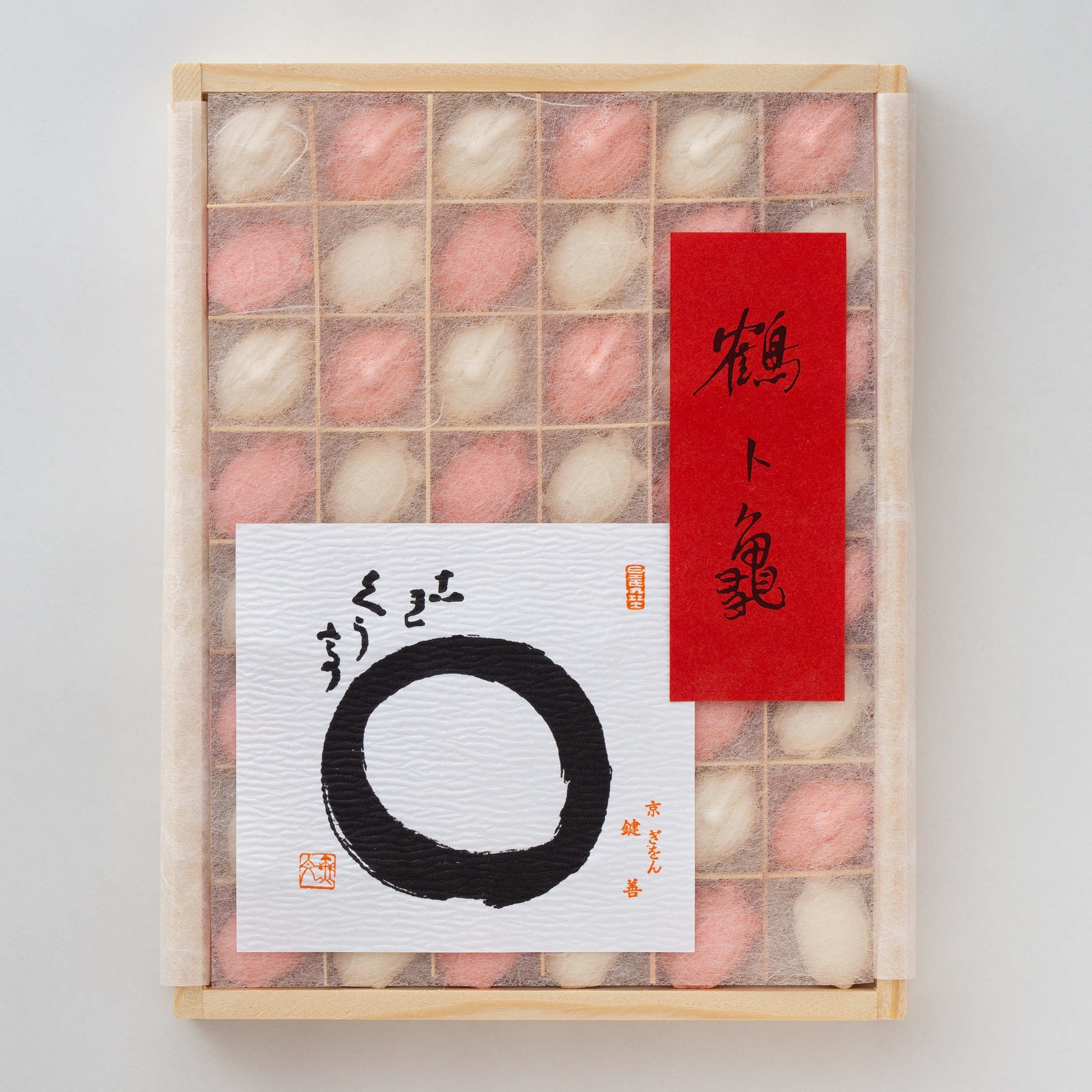 「鶴」「亀」を型どり紅白でお詰め合わせいたしました。お慶びのお席や引出物としてもご利用戴いております。